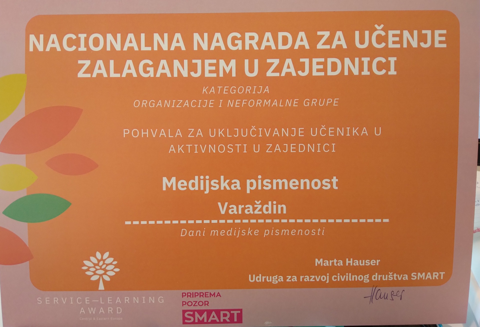POHVALA Udruge za razvoj civilnog društva SMART za uključivanje učenika u aktivnosti u zajednici preko autorske platforme "Medijska pismenost Varaždin" u području pedagogije učenja zalaganjem u zajednici.